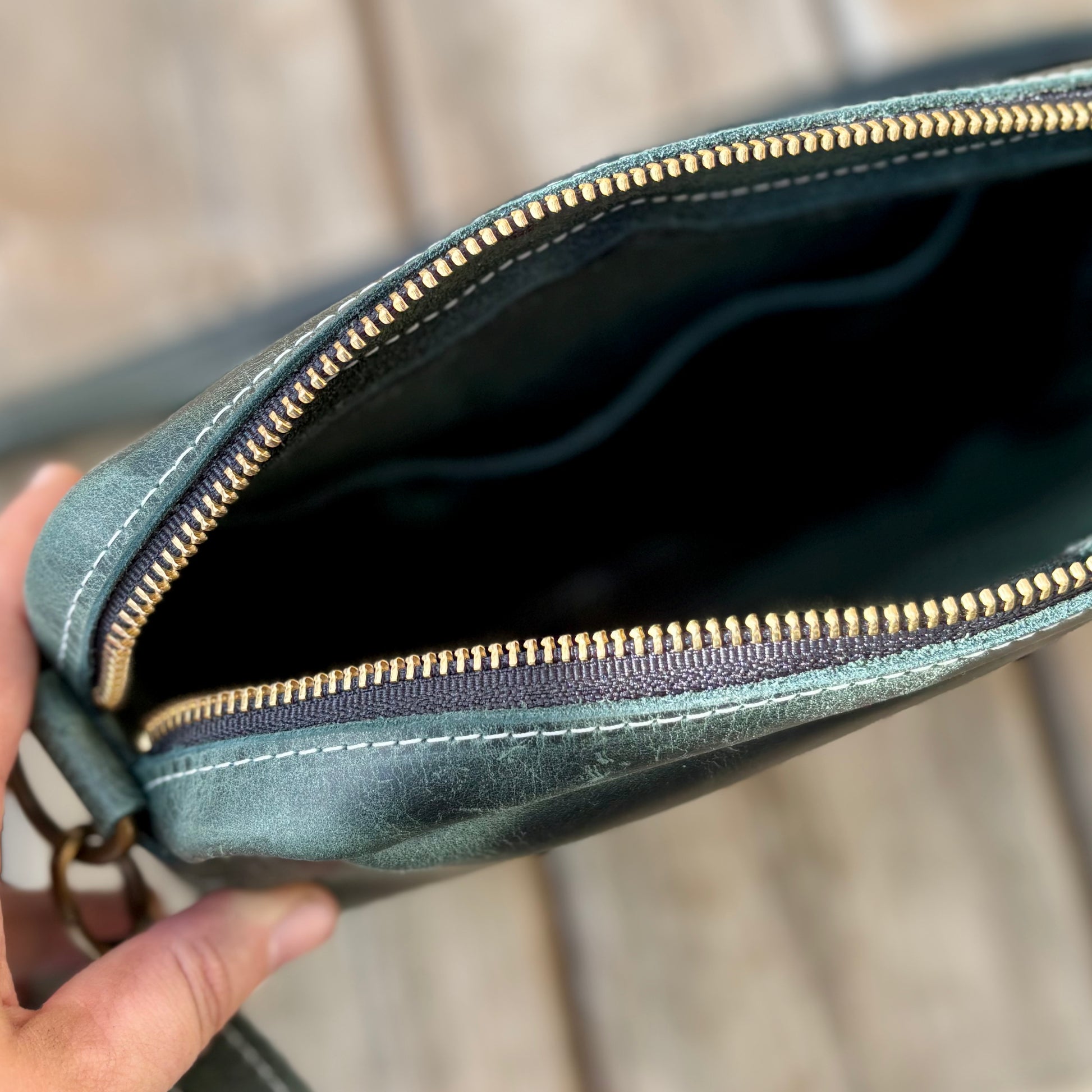 Made with structured 3-4oz full grain leather, these bags feature the natural marbling of the leather itself. Comfortably fits a tablet or kindle, your wallet, keys, lip gloss, etc.